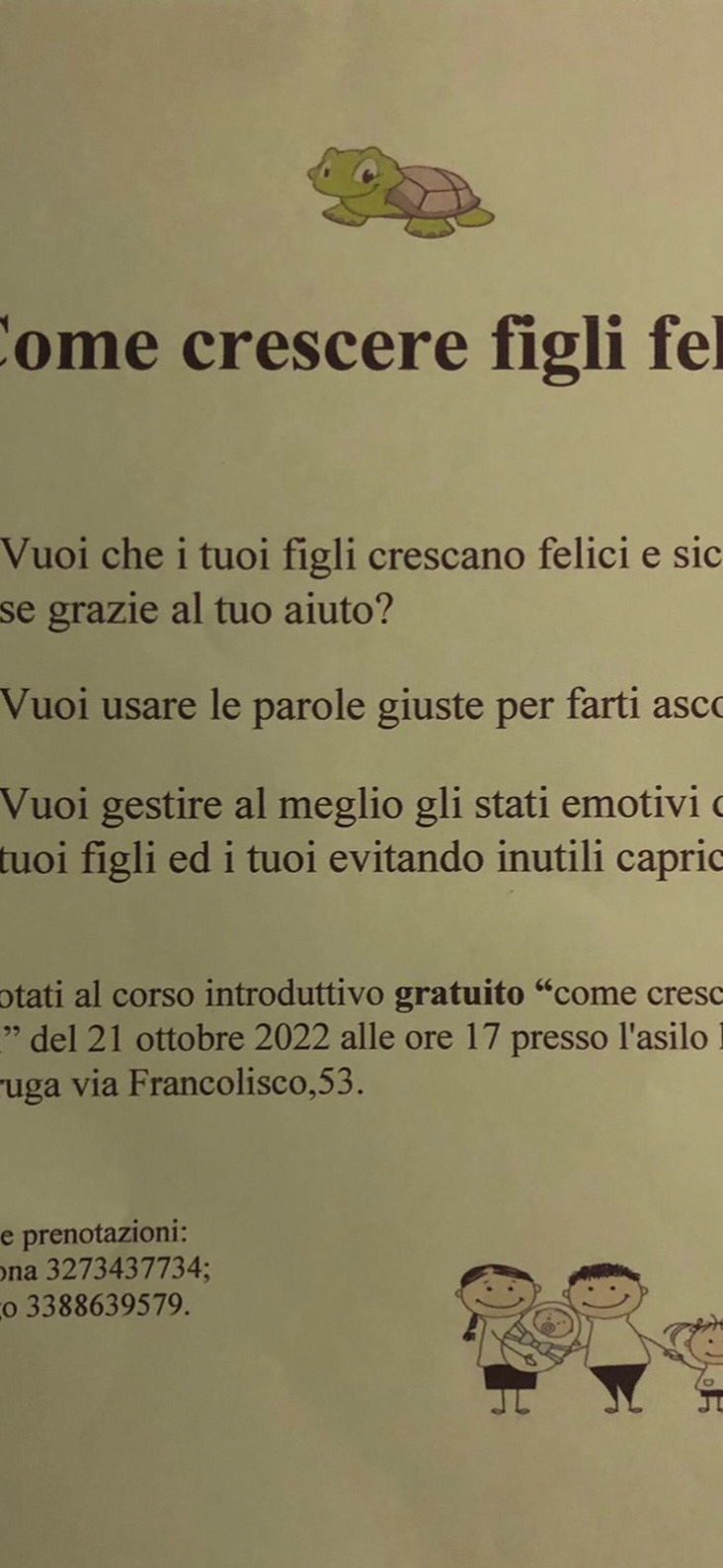 Corso per i genitori 21 ottobre dalle 17 alle 19 per info simona 3273437734